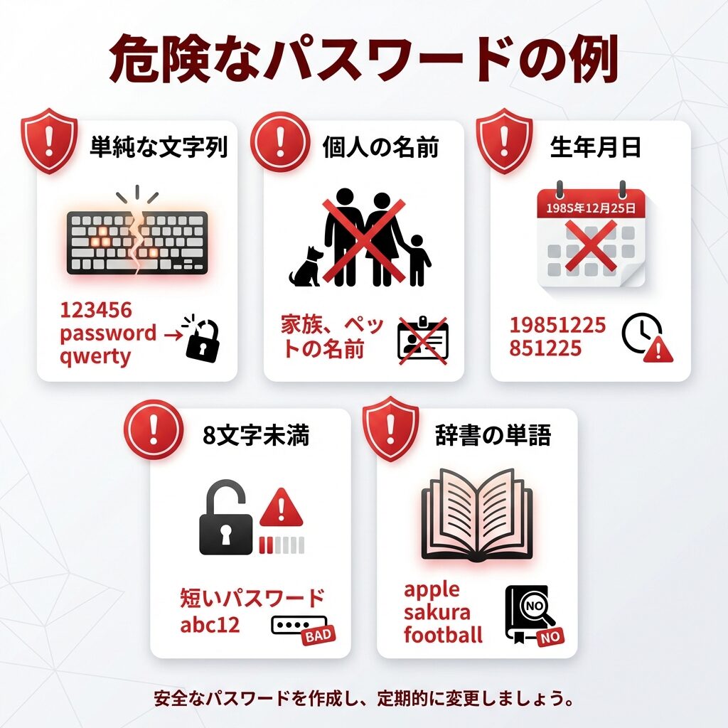 これらのパスワードは「覚えやすい=推測されやすい」という特徴があります。攻撃者は、よく使われるパスワードのリストを使って次々と試行するため、単純なパスワードはすぐに破られてしまいます。
