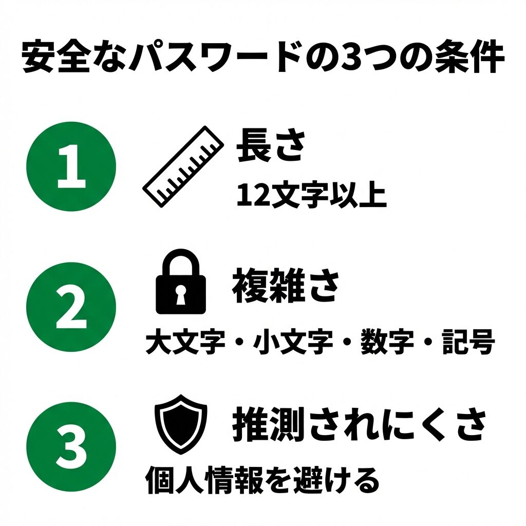 - 安全なパスワードの作り方:安全なパスワードには、①12文字以上の長さ、②大文字・小文字・数字・記号の組み合わせ、③推測されにくい文字列、という3つの条件が必要です。