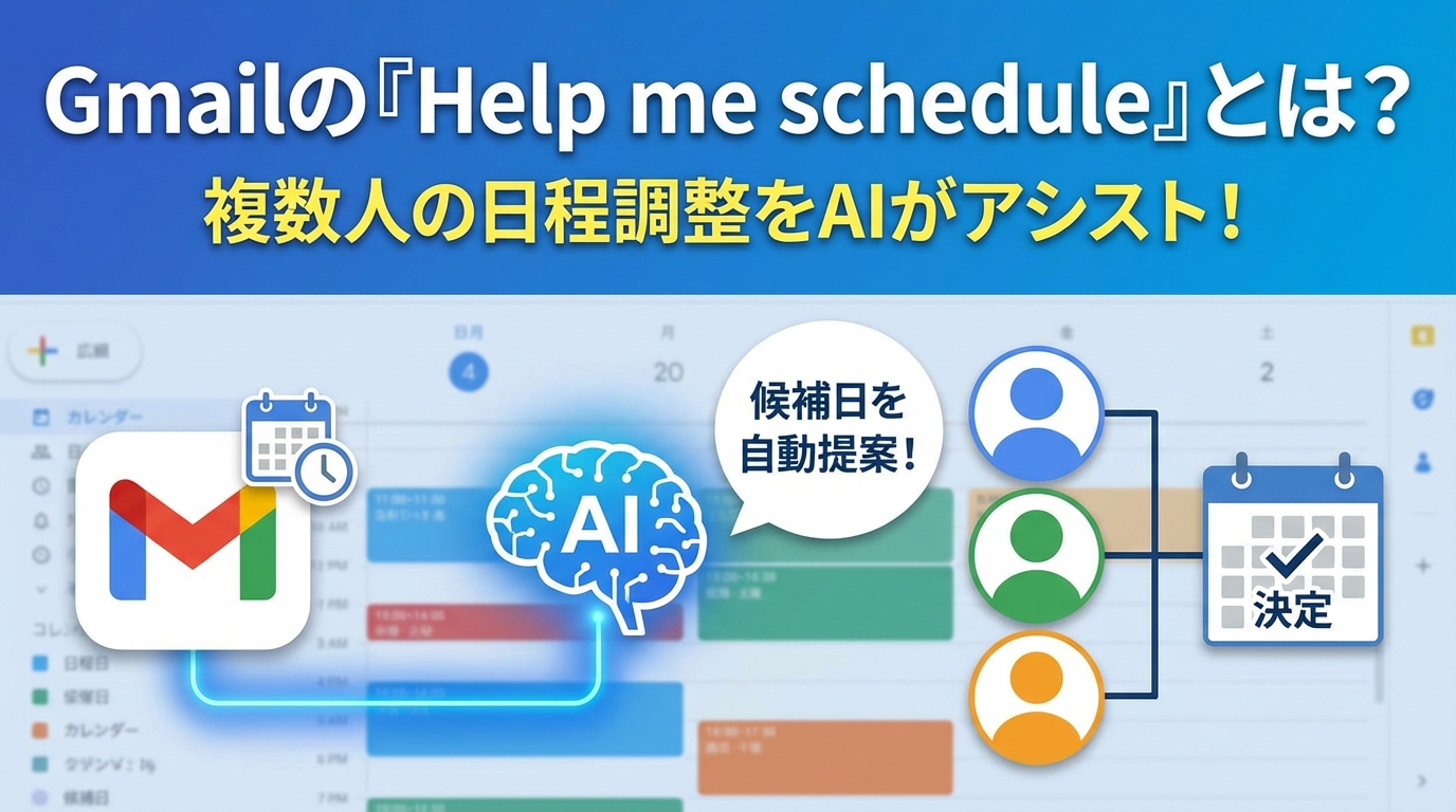 本記事では、Gmail Help me scheduleの複数人対応アップデートについて、できること、基本的な使い方、Google Calendarとの違い、使う前に知っておきたい注意点をわかりやすく整理します。(専門知識は不要です!)