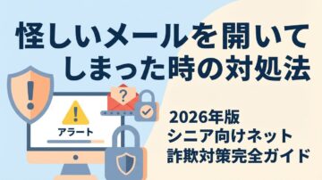 「怪しいメールを開いてしまった…どうしよう」「これって詐欺メール?」と不安になっていませんか? 2025年の特殊詐欺被害額は1,200億円を超え、過去最悪を記録しました。特にシニア層を狙った巧妙な詐欺メールや偽警告画面が急増しており、「パソコンに慣れていない」「誰に相談すればいいかわからない」という不安を抱える方が増えています。 💡 ネット詐欺は「偽の警察官」 ネット詐欺は、偽の警…