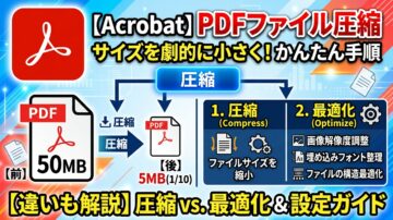 Acrobatデスクトップ版でPDFを圧縮する方法|最適化との違いと設定 AcrobatでPDFを軽くしたいのに、「PDFを圧縮」と「最適化されたPDF」が並んでいて、どちらを使えばよいか迷うことがあります。この記事では、主にAcrobatデスクトップ版の現行UIを前提に、すばやく軽くしたい場面と、原因を見ながら細かく調整したい場面の使い分けを整理します。 Acrobatの「サイズが縮小されたPD…