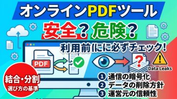 「PDFを今すぐ結合・分割したいけれど、会社資料をアップロードして大丈夫なのか不安」と感じる方は少なくありません。オンラインPDFツールは便利ですが、すべてのPDFを同じ基準で扱うと判断を誤りやすくなります。 オンラインPDFツールを使ってよいファイルと、オフライン優先にすべきファイルの違い ログイン有無、自動削除、ローカル処理など、安全性を見るときの確認ポイント 公開可資料・個人情報あり・契約書…