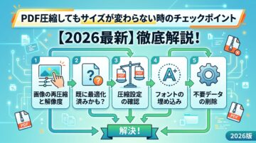 PDFを圧縮したのにサイズがほとんど変わらないと、「やり方が間違っているのでは」と焦ってしまいますよね。ですが、PDFが小さくならない原因はツールの不具合だけではなく、元ファイルの構成や、すでに最適化されている状態にあることも少なくありません。 PDFを圧縮しても小さくならない主な原因 文字だけPDF・スキャンPDF・署名付きPDFごとの確認ポイント 提出前にあわてないための切り分け手順と対処法 …