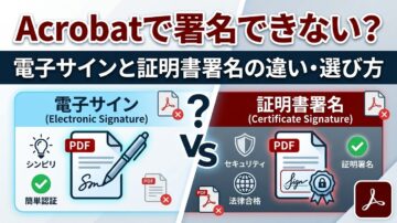 PDFに署名しようとしてAcrobatを開いたのに、「思った場所に署名できない」「電子サインと電子署名の違いがわからない」と迷っていませんか。PDFの署名は見た目を入れればよい場合と、本人確認や改ざん防止まで求められる場合で、選ぶ方式が変わります。 Acrobatで使う「電子サイン」と「証明書署名」の違い 学校提出・役所提出・契約書で迷いにくい選び方 署名できない原因と、無料でできる範囲の見分け方…