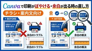 Canvaで印刷がぼやける・余白が出る時の直し方|チラシ・案内文向け Canvaで作ったチラシや案内文は、画面ではきれいに見えても、いざ印刷すると「ぼやける」「白フチが出る」「QRコードが読めない」といった失敗が起きやすいです。特に町内会のお知らせ、学校配布物、店舗チラシのように紙で渡す用途では、デザインそのものよりも、サイズ設定や出力条件のほうが仕上がりを左右することが少なくありません。 Can…